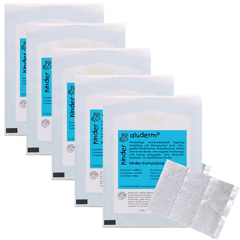 Детские компрессы aluderm® размером 8x6 см для поверхностных ран и травм. Стерильные перевязочные материалы с алюминизированной раневой подушечкой, мягкие, гипоаллергенные, не прилипают к ране, сильно впитывающие и дышащие. Индивидуальная упаковка, специально разработанная для детей с учетом возрастных особенностей.