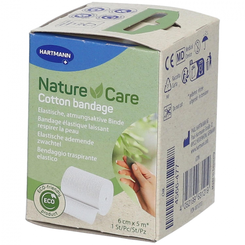 Эластичная хлопковая бинтовая повязка Nature Care для медицинского применения. Размер 6 см х 5 м. Используется для фиксации перевязочных материалов и стабилизации мышц и суставов. Производится в Германии компанией PAUL HARTMANN AG.