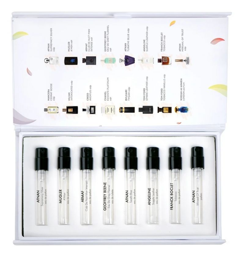 Наши специалисты создали уникальную подборку ароматов-двойников топовой мужской парфюмерии. Набор содержит восемь ароматических композиций от разных брендов. Каждая из них обладает очень близким звучанием к определенному дорогому элитному парфюму. Примерив их на себя, вы можете найти свой идеальный аромат, который захотите приобрести в оригинале.