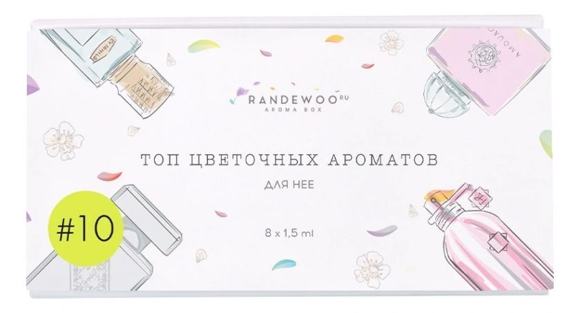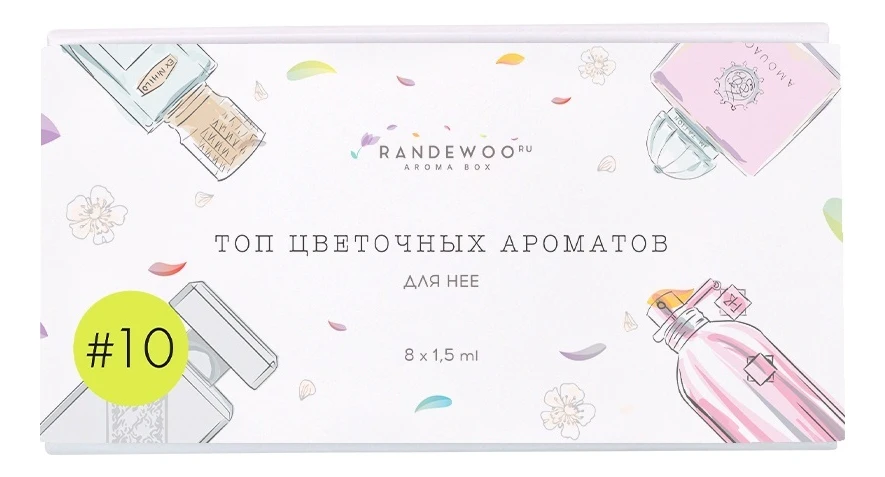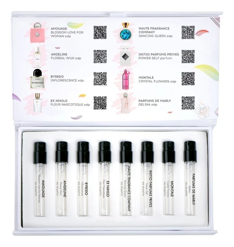 В наборе восемь ароматических композиций от разных брендов. Каждая из них обладает своим характером, индивидуальностью и уникальным стилем. С их помощью вы можете моделировать образ, подчёркивать свой вкус, женственность и нежность. Примерив уникальные композиции, вы можете также найти свой идеальный аромат, который потом захочется купить в большем объёме.