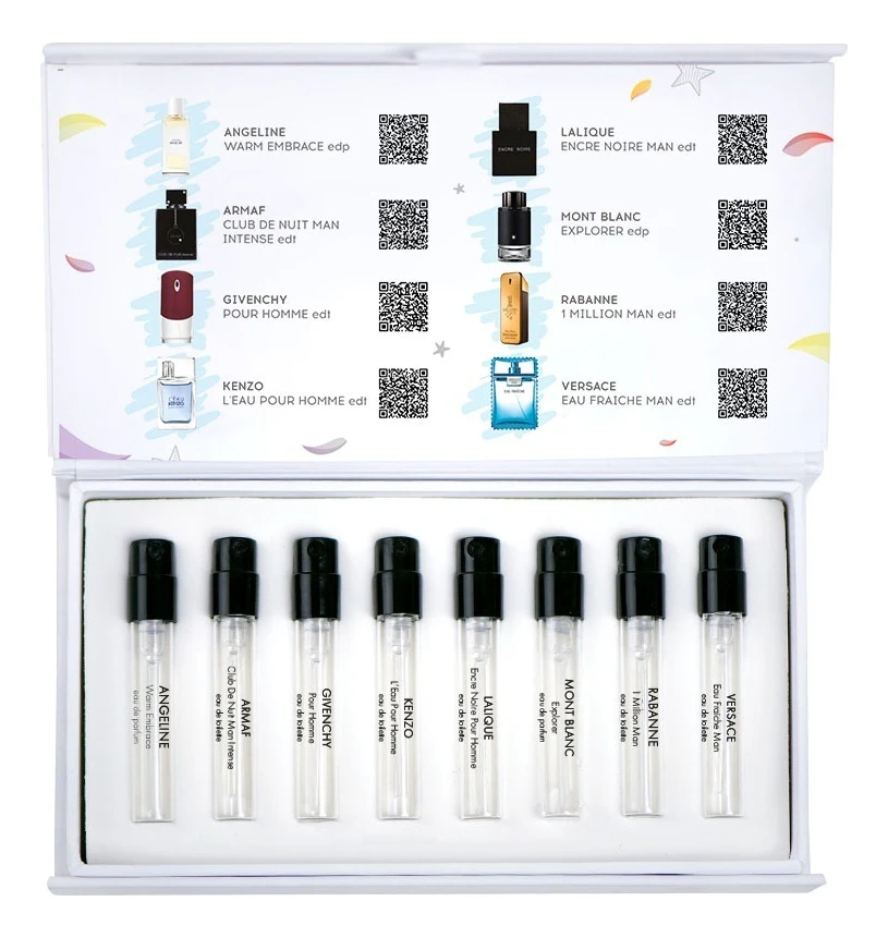 В набор входит восемь пробников ароматов высочайшего качества (каждый мини-флакон объёмом 1,5 мл обеспечивает до 35 распылений). Пробуя эти модные ароматы, вы совершенствуете свой стиль и можете выбрать свой идеальный парфюм.