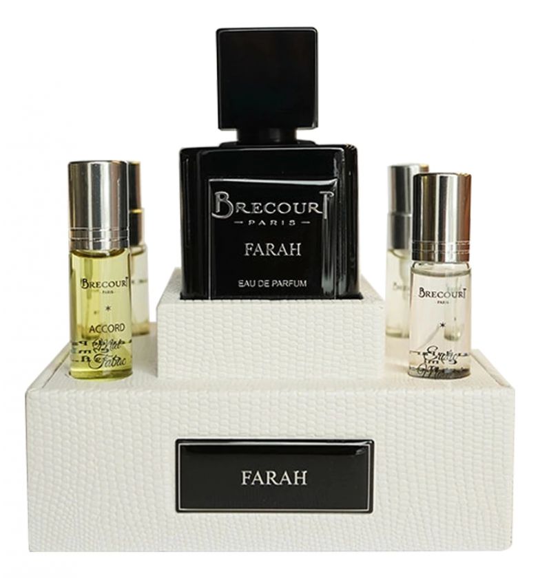 Верхние ноты Farah от Brecourt образованы корицей, бергамотом и стираксом. В сердце переливаются ноты меда, кожи, кедра и фиников. В завершении звучит база, включающая аккорды лабданума, пачули, бензоина, бобов тонка и мускуса.