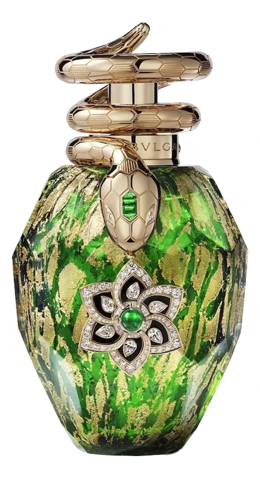Граненый, как драгоценный камень, флакон имеет зеленый цвет с золотыми мазками и украшен ювелирной змеёй с подвеской, которые также можно носить в качестве броши. Змея и подвеска инкрустированы бриллиантами, изумрудами и ониксом.