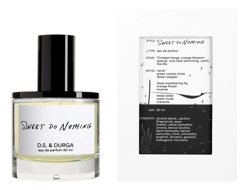 Ароматическая композиция характерна тонкими зелеными оттенками экзотического кактуса, сладкими сочными фруктовыми аккордами инжира, цветочными нотами душистого апельсинового цвета и сухими древесно-амариллисовыми акцентами эфирного масла нероли (белых цветков горького апельсина). Парфюм D.S.& Durga Sweet Do Nothing продолжается согревающими смолистыми сливочно-хвойными оттенками техасского кедра, дымными древесно-бальзамическими акцентами божественного ладана, уникальными акцентами желтых цветов креозотового куста, специевыми аккордами перца и чувственными мускусными нотами.