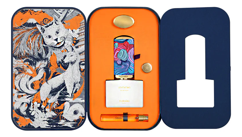 Парфюм Floraiku Levitating заключен в белый флакон с высоким колпачком, обтянутым итальянской гранулированной кожей с изображением разноцветных волн. Чехол колпачка сшит вручную и может использоваться в качестве футляра для миниатюры-рефила объемом 10 мл.