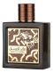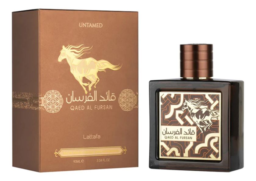 Аромат Lattafa Qaed Al Fursan Untamed, который шепчет о пустынных ночах и скрытых сокровищах, помещен в прямоугольный коричневый флакон, украшенный изображением скачущей лошади.
