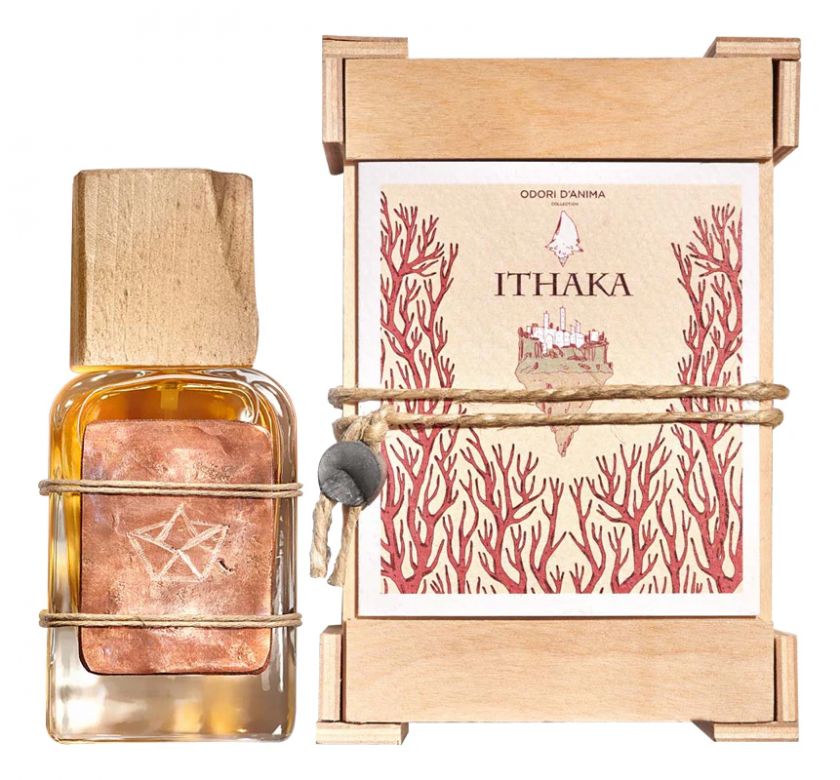 Парфюм Ithaka построен вокруг насыщенных бальзамических нот бензоина, ладана и лабданума. Основной аккорд поддерживают более умеренные древесно-дымные запахи кедра и тёплых специй, тонкие амбровые, зелёные и цветочно-цитрусовые акценты.