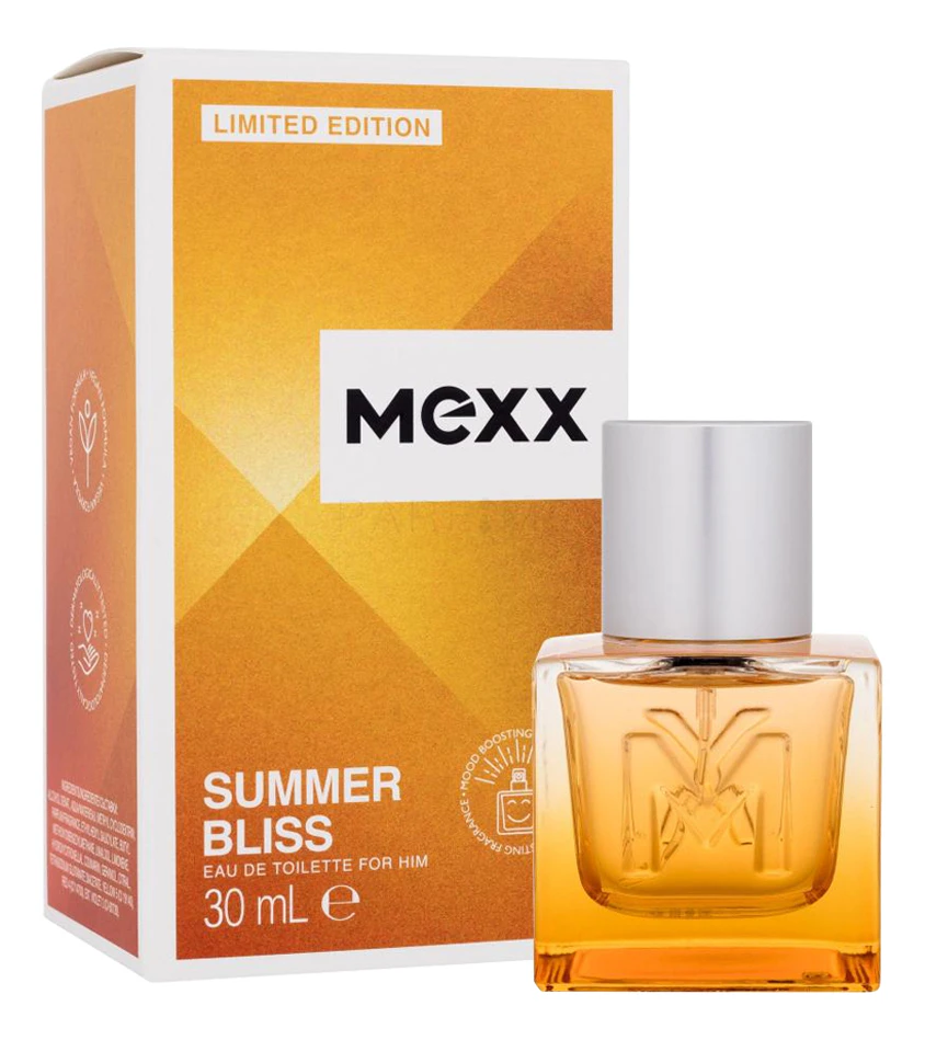 Mexx Summer Bliss For Him — освежающий цветочно-фруктовый аромат для женщин освежающий цветочно-фруктовый аромат для женщин, выпущенный в 2023 году нидерландским домом моды Mexx в рамках ароматического дуэта Summer Bliss. Выпущенные ограниченным тиражом ароматы с названием «Летнее блаженство» сочетают в себе яркие, искрящиеся, бодрящие и поднимающие настроение ноты, чтобы создать ощущение радости и хорошего самочувствия.