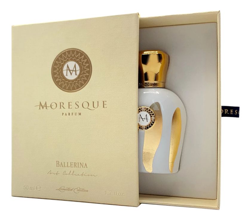 Ballerina — легкий, волнующий и словно парящий в воздухе многогранный цветочно-древесный аромат с тонкими, мерцающими мускусными оттенками, выпущенный итальянским нишевым парфюмерным брендом Moresque в рамках коллекции Art Collection Moresque. Традиционный для бренда флакон из мурановского стекла на этот раз окрашен в матовый пудрово-белый цвет и украшен золотыми штрихами.