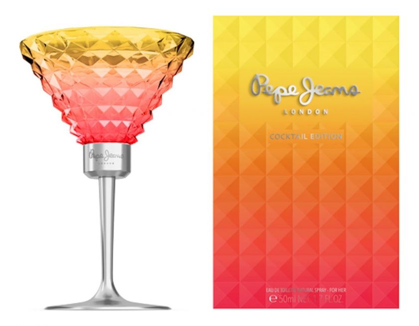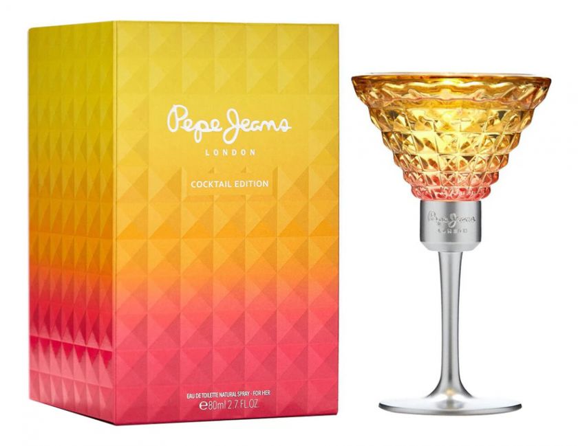 Pepe Jeans London Cocktail Edition For Her — жизнерадостный женский цветочно-фруктовый аромат, выпущенный британским модным домом Pepe Jeans. Заключенный в очаровательный флакон в форме радужного бокала на серебристой ножке аромат поражает нотами сияющего летнего дня. Изысканное хрустальное стекло сияющего солнечно-желтого цвета с оттенком розового цвета тутти фрутти вдохновлено восходом солнца на тропическом пляже.