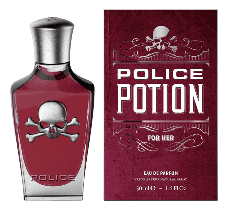 Police Potion For Her — глубокий, многогранный и магнетический женский цветочно-фруктовый аромат, выпущенный в 2022 году брендом Police в рамках ароматического дуэта Potion для него и для нее, вдохновленного волшебным миром зелий. Форма флакона навеяна старинными колбами, переработанными в современном и вневременном ключе. Лиловый флакон украшен принтом с серебристым черепом и перекрещенными костями, напоминая о таинственном и опасном мире зелий.