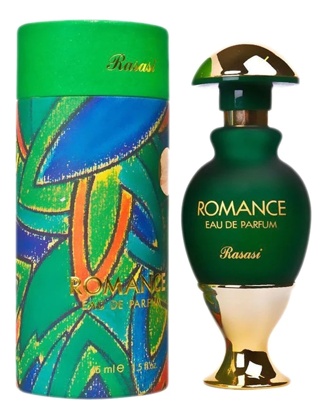 Romance Eau De Parfum – тонкий, манящий и грациозный женский восточно-цветочный парфюм с легкими акцентами свежей зелени, выпущенный под маркой известного арабского парфюмерного дома Rasasi в очаровательном золотисто-зеленом флакончике.