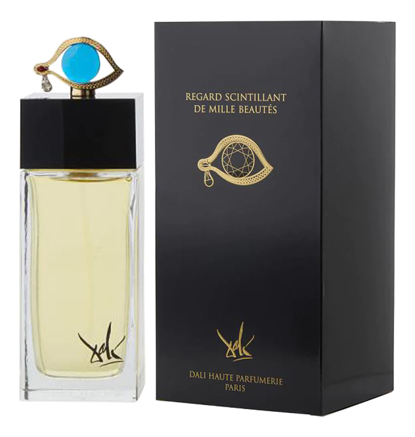 Аромат Salvador Dali Regard Scintillant De Mille Beautes заключен в изысканный флакон, украшенный на колпачке стилизованным раскрытым глазом, выполненным из золота и синего кристалла.
