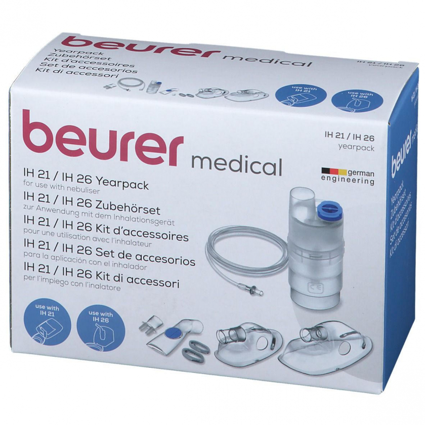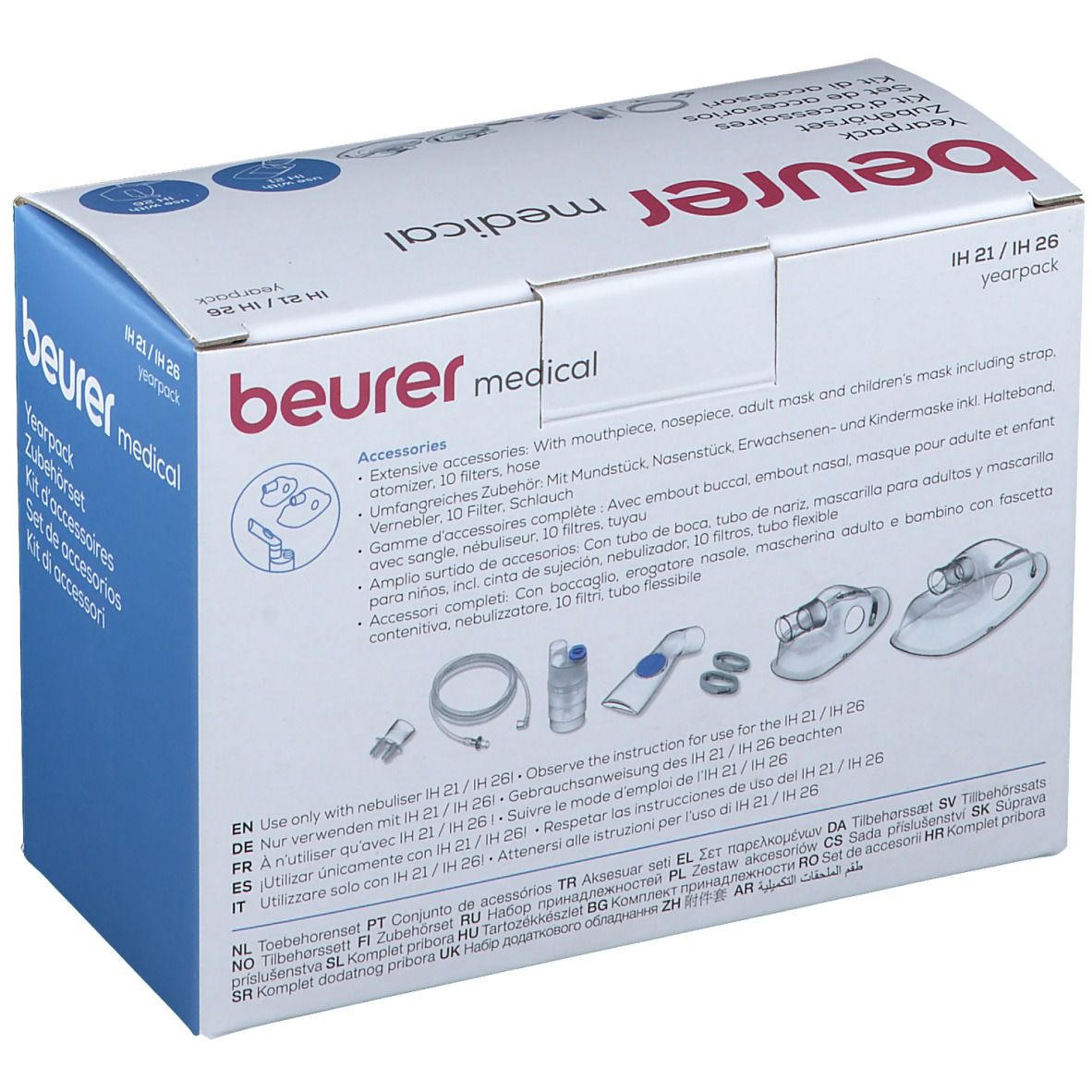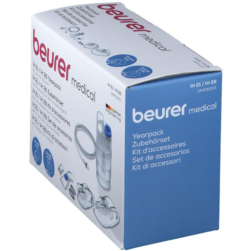 Комплект аксессуаров Beurer Yearpack для ингаляционных приборов IH 21, IH 25, IH 26. Включает мундштук, насадку для носа, маску для взрослых, детскую маску, небулайзер, 10 фильтров и шланг для проведения ингаляционных процедур.