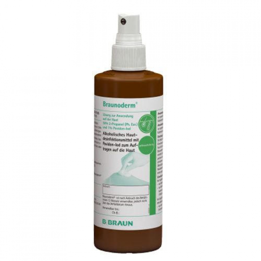 Braunoderm® - готовая к применению спиртовая повидон-йодная дезинфицирующая жидкость для кожи. Предназначена для дезинфекции кожи перед оперативными вмешательствами и пункциями. Обладает быстрым действием (от 15 секунд) и длительным эффектом благодаря комбинации спирта и повидон-йода. Эффективна против бактерий (включая MRSA, туберкулезные бактерии), грибков и многих вирусов. Обеспечивает хорошую визуальную маркировку обработанного участка кожи.