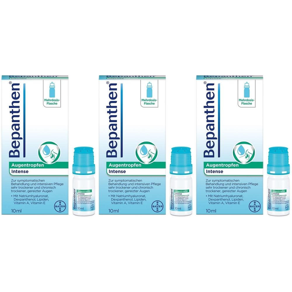 Bepanthen® Augentropfen Intense - интенсивные глазные капли для лечения очень сухих и хронически сухих глаз. Содержат инновационный липидный защитный комплекс, гиалуроновую кислоту и декспантенол для длительного увлажнения, регенерации и защиты глаз. Подходят для носителей контактных линз, не содержат консервантов.