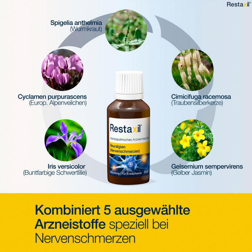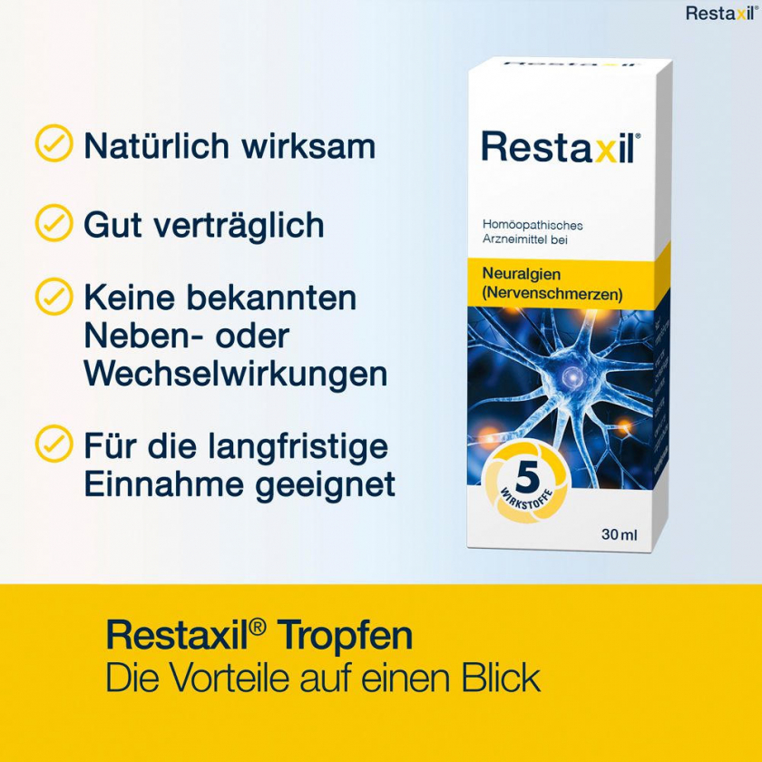 RESTAXIL® - гомеопатическое лекарственное средство для лечения нервных болей (невралгий). Содержит 5-компонентный комплекс растительных ингредиентов в гомеопатических разведениях. Применяется при хронических болях в спине, фибромиалгии, диабетической полинейропатии. Без известных побочных эффектов и взаимодействий с другими лекарствами.