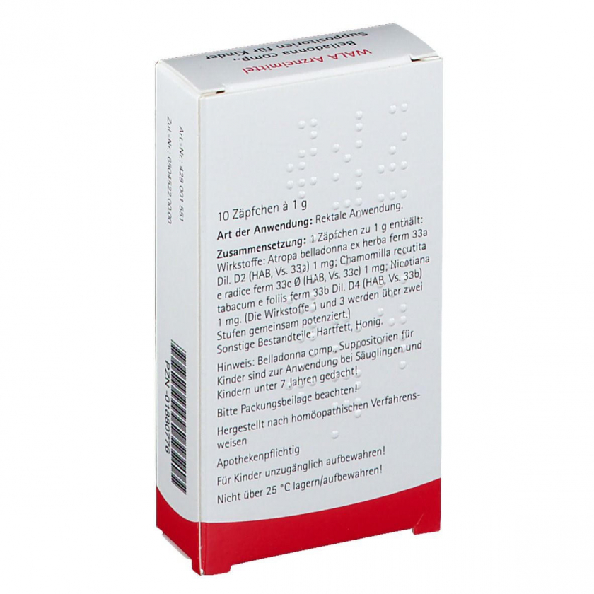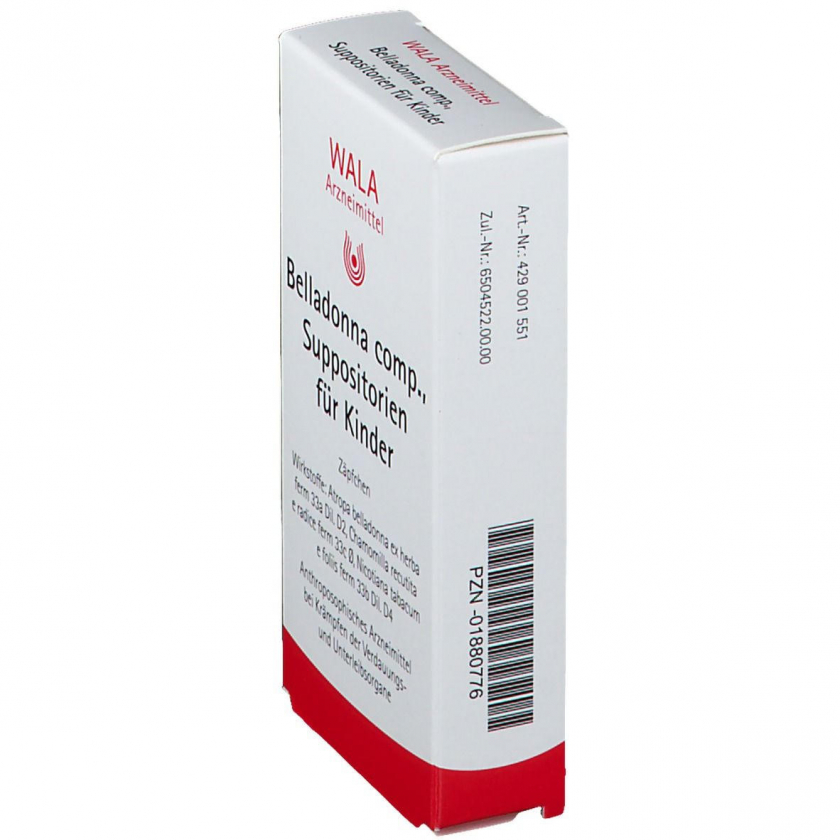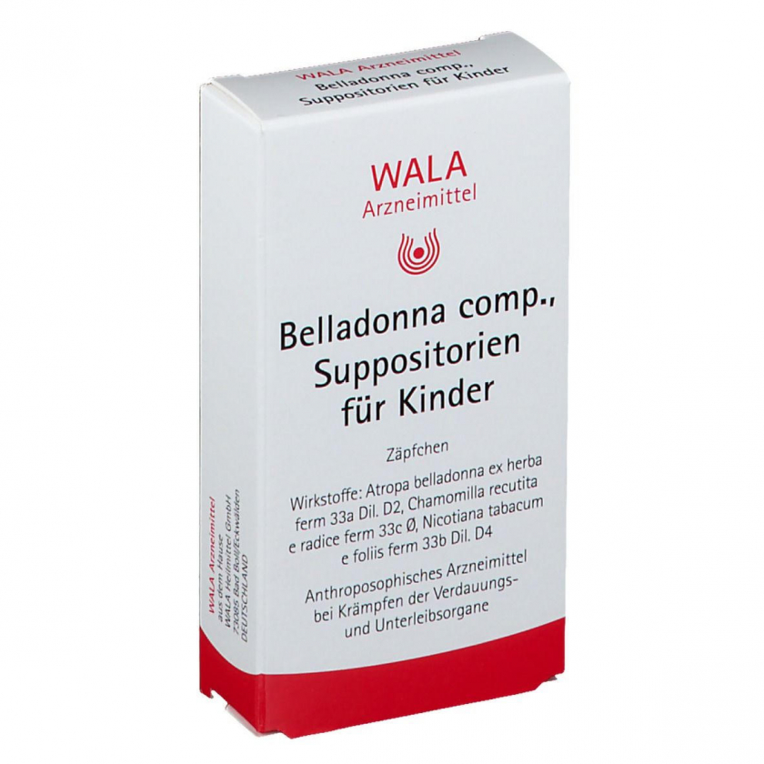Гомеопатические детские суппозитории WALA® Belladonna Comp. для ректального применения. Содержат растительные компоненты: белладонну, ромашку и табак в гомеопатических разведениях. Без указания терапевтических показаний как гомеопатическое средство.