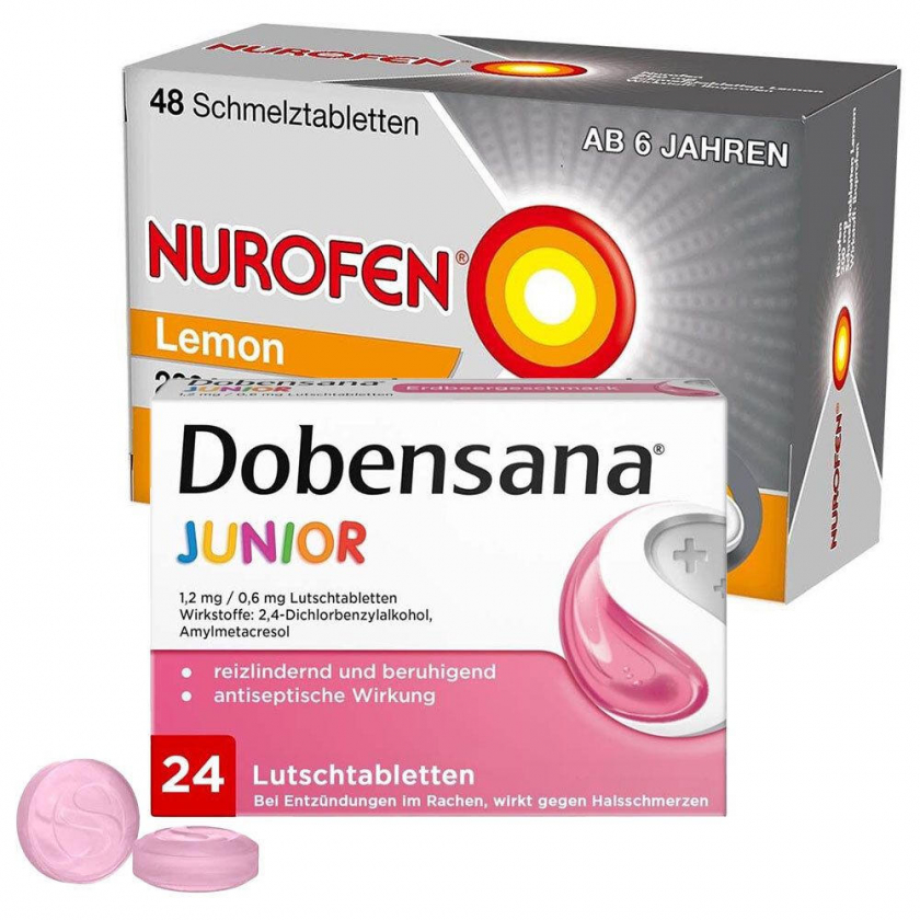 Набор из двух препаратов: NUROFEN 200 мг шипучие таблетки с лимонным вкусом для снятия боли и жара у детей от 6 лет, и Dobensana Junior пастилки с клубничным вкусом для лечения первых симптомов боли в горле у детей от 6 лет. Оба препарата можно принимать без воды.