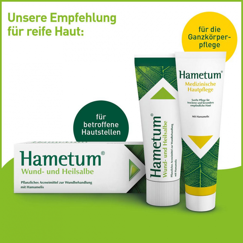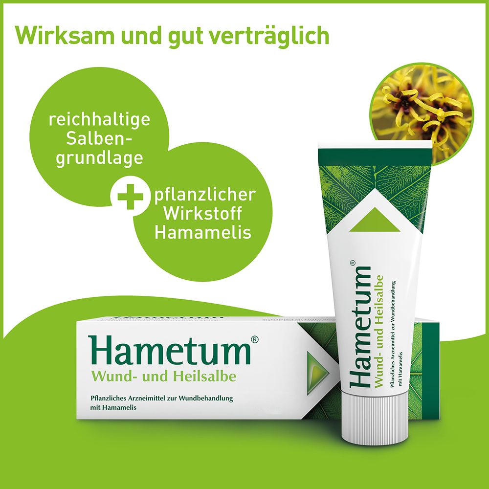 Hametum® Wund- und Heilsalbe - лекарственная мазь для наружного применения на основе экстракта гамамелиса (ведьминого ореха). Применяется при легких кожных повреждениях, небольших воспалениях кожи и слизистых оболочек. Особенно рекомендуется для чувствительной зрелой кожи, способствует заживлению ран, снимает зуд и воспаление, останавливает небольшие кровотечения.