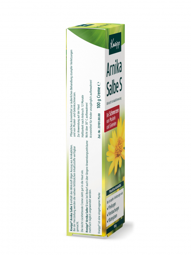 Мазь Kneipp® Arnika Salbe S с 10% экстрактом арники для наружного применения при травмах, ушибах, растяжениях, гематомах, ревматических болях и воспалениях от укусов насекомых. Легко впитывающаяся кремовая текстура с охлаждающим эффектом.