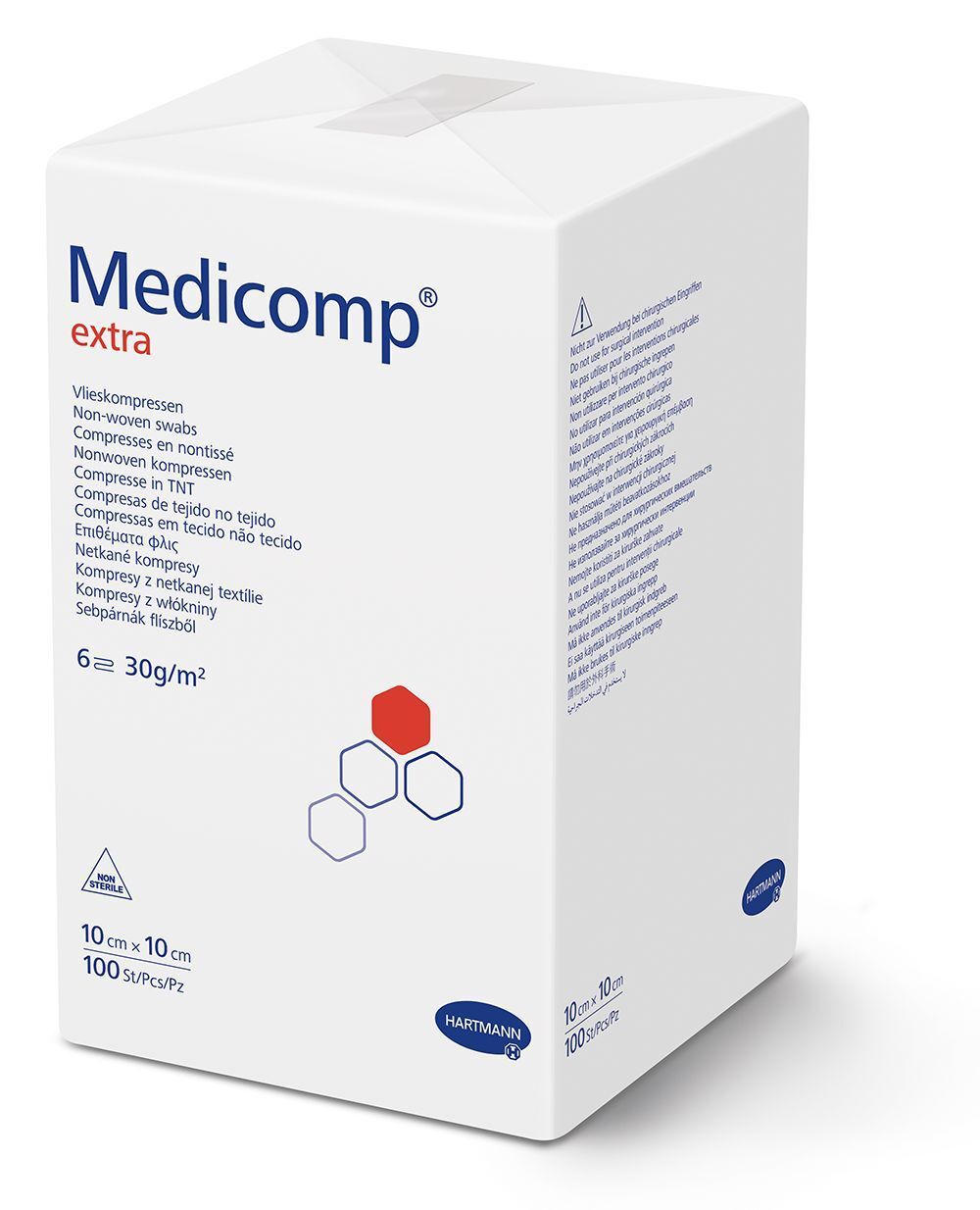 Medicomp® extra - нестерильные компрессы 6-слойные размером 10x10 см для общего ухода за ранами. Используются как тампоны и компрессы при небольших оперативных вмешательствах, дренажах, трахеостомиях и других медицинских процедурах. Обладают повышенной впитывающей способностью, без отбеливателей и связующих веществ