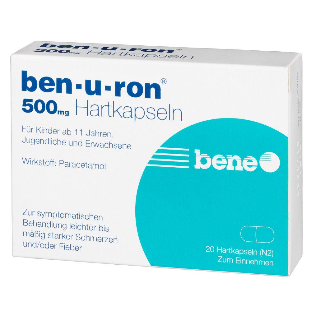 Ben-u-ron® 500 mg - лекарственный препарат на основе парацетамола для симптоматического лечения легкой и умеренной боли, а также снижения температуры. Применяется у детей от 9 лет, подростков и взрослых. Выпускается в форме твердых капсул.