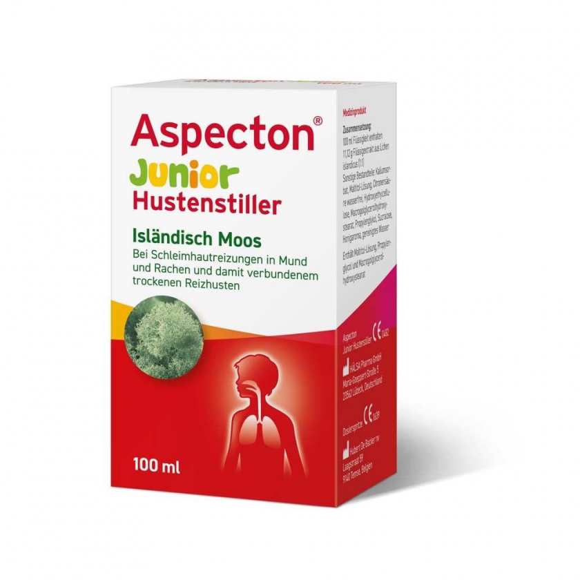 Aspecton® Junior Hustenstiller - детский сироп от сухого кашля на основе экстракта исландского мха для снятия раздражения слизистых оболочек рта и горла. Не содержит алкоголя, сахара, глютена и лактозы. Подходит для детей от 1 года до 16 лет.