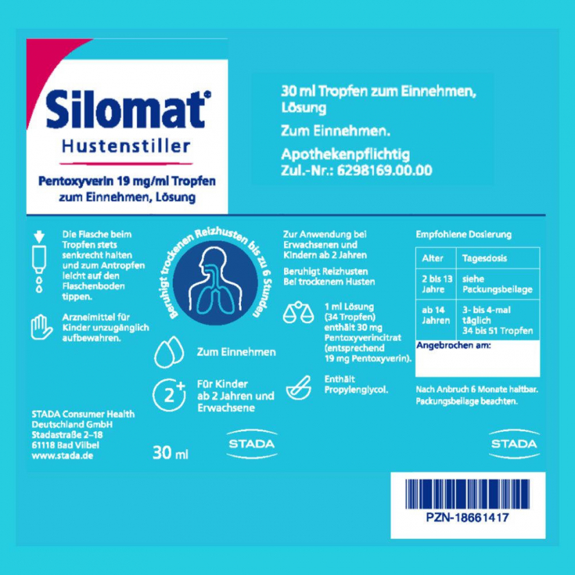 Silomat Pentoxyverin капли 30 мл - противокашлевое средство для быстрого и длительного облегчения сухого кашля у взрослых и детей от 2 лет. Действует через 10-20 минут, эффект сохраняется 4-6 часов. Не содержит кодеина и алкоголя, подходит для диабетиков.