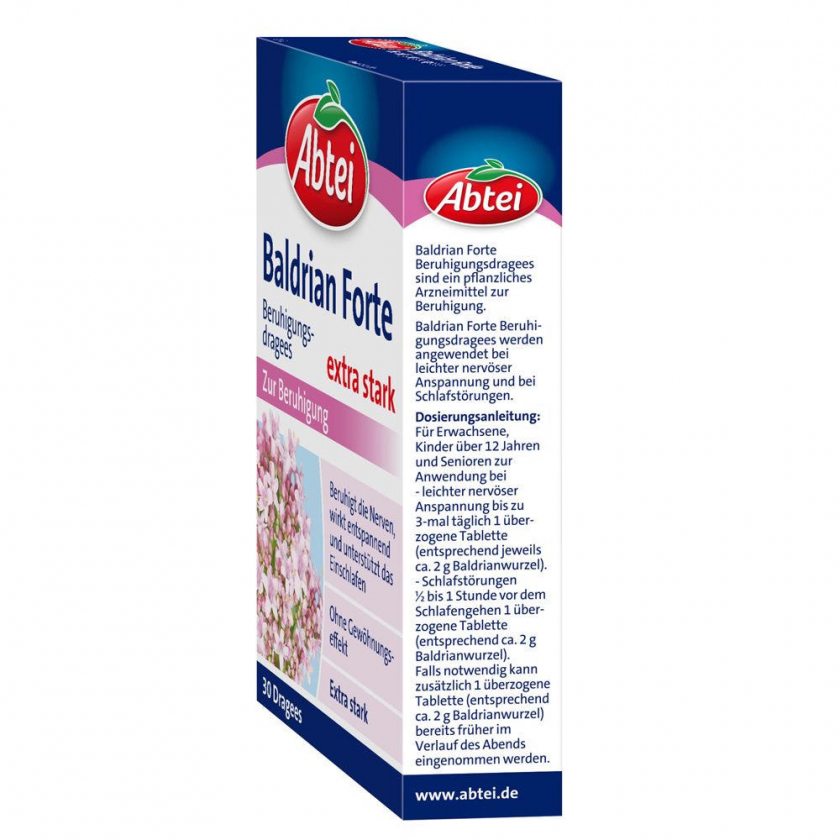 Растительное успокоительное средство Abtei Baldrian Forte на основе экстракта корня валерианы для снятия нервного напряжения, лечения беспокойства и нарушений сна. Не вызывает привыкания, подходит для взрослых и детей старше 12 лет.