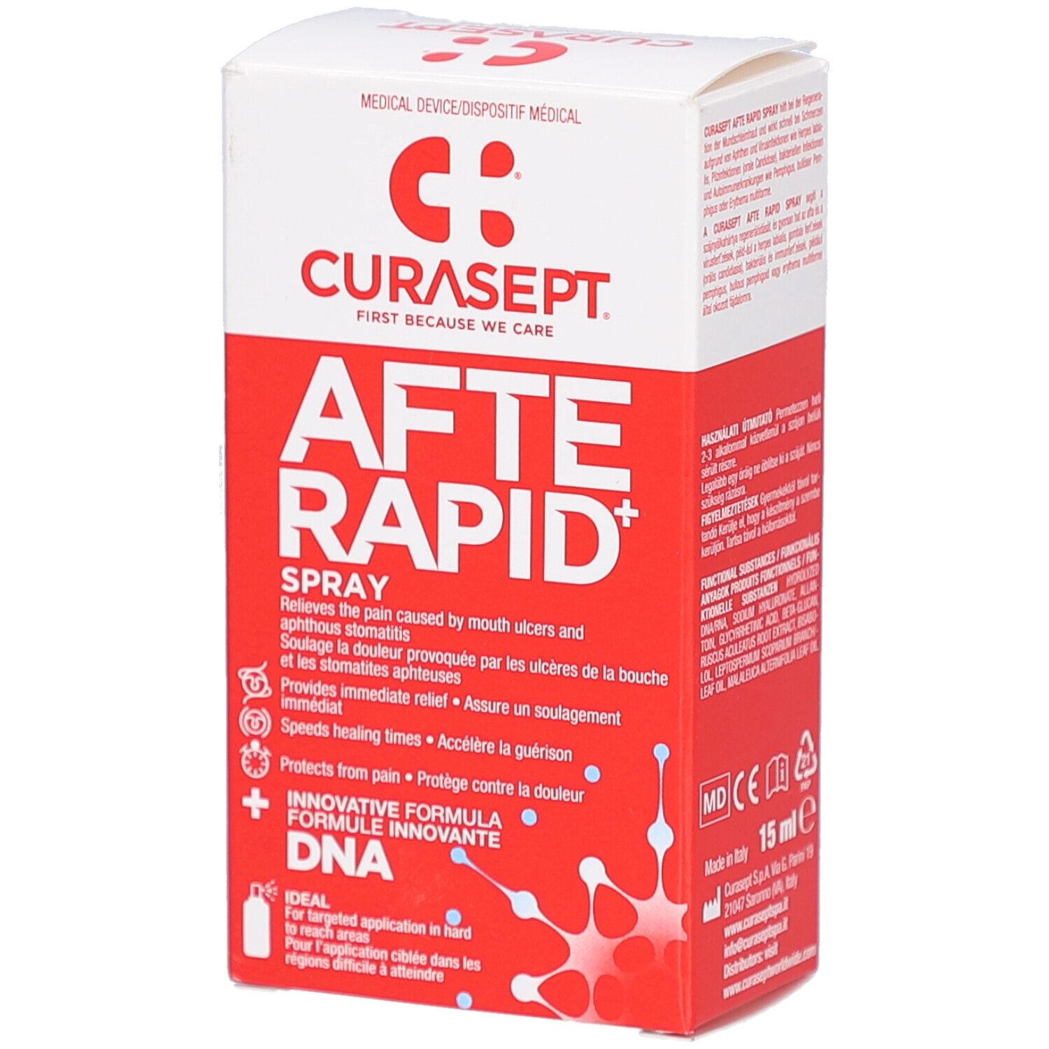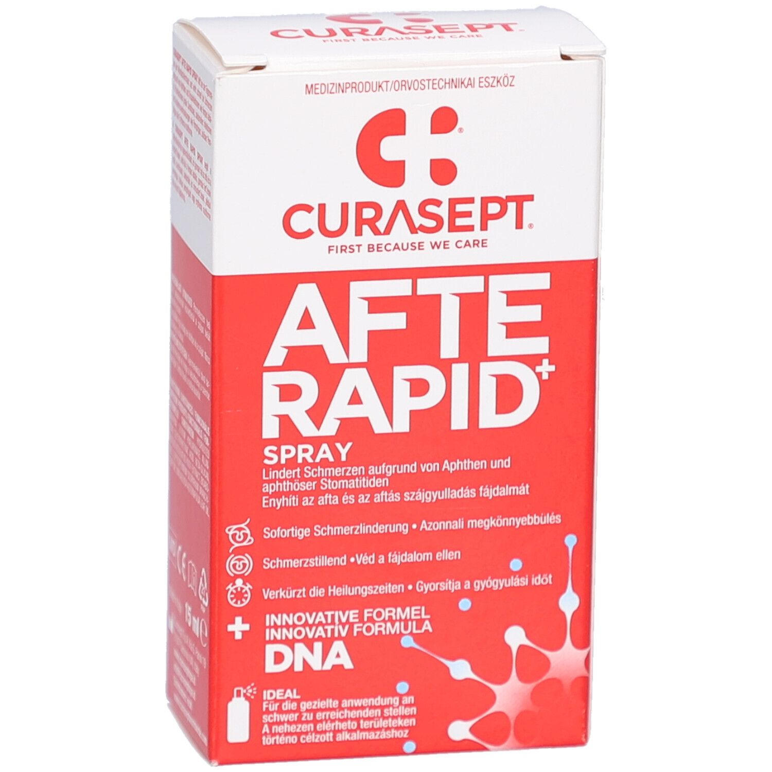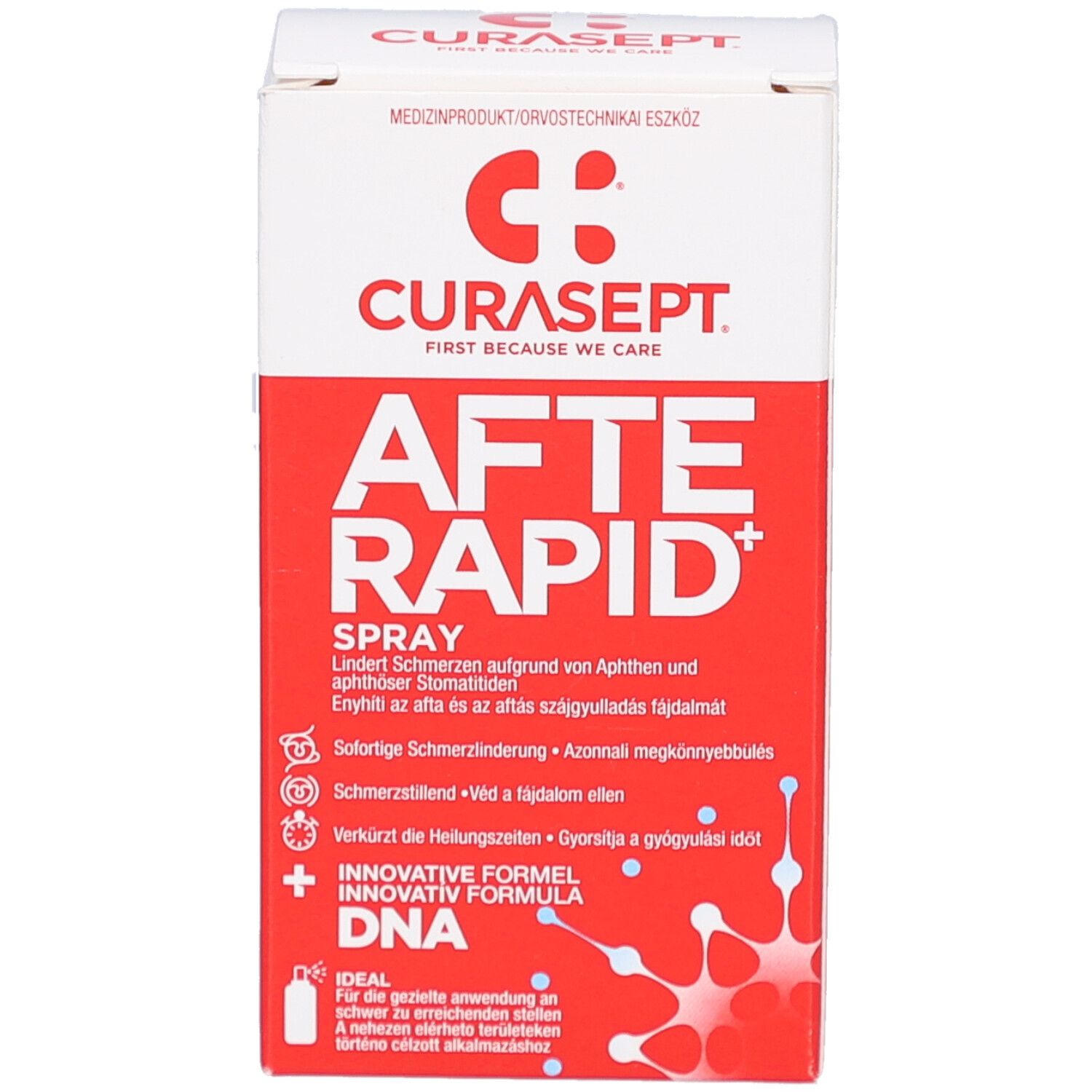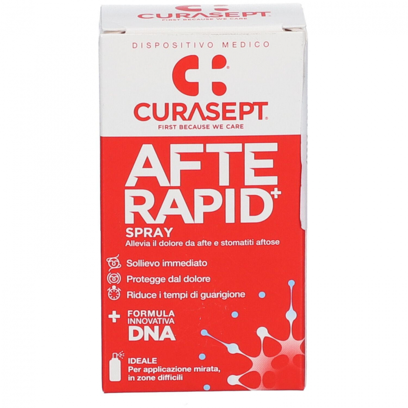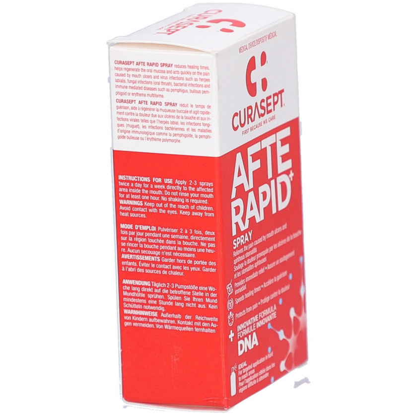 CURASEPT® AFTERAPID DNA Spray - спрей для лечения болезненных воспалений слизистой оболочки рта и афт. Содержит ДНК и гиалуроновую кислоту для ускорения заживления, регенерации тканей и быстрого обезболивания. Идеален для обработки труднодоступных участков.