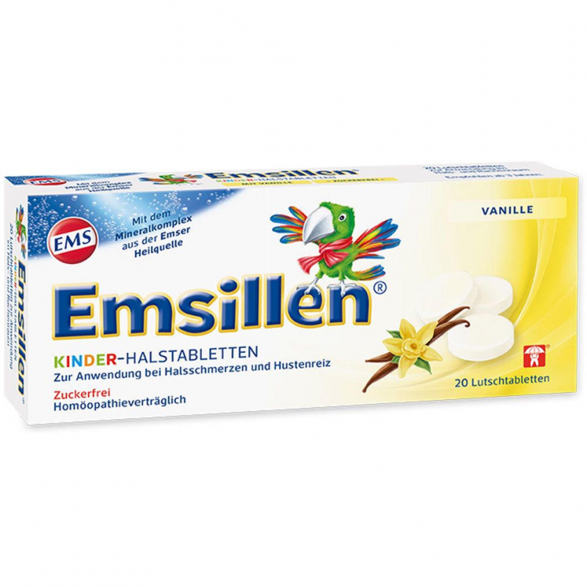 Emsillen Kinder-Halstabletten Vanille - таблетки для рассасывания от боли в горле для детей на основе натурального EMS-минерального комплекса. Помогают при воспалениях горла и глотки, увлажняют и очищают слизистую, снимают боль, облегчают глотание и кашель. Не содержат сахара, глютена, лактозы, искусственных красителей, подходят для веганов и одобрены как безопасные для зубов.