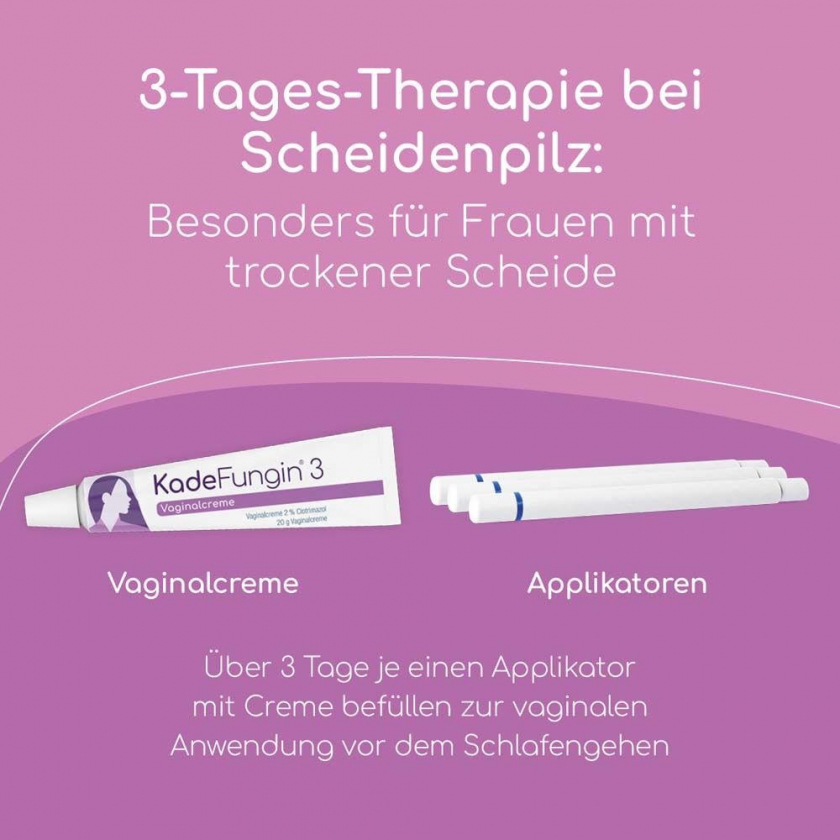KadeFungin 3 Vaginalcreme - противогрибковый препарат для лечения вагинальных инфекций, вызванных дрожжевыми грибками. Содержит клотримазол, применяется вагинально с помощью аппликатора в течение 3 дней. Особенно подходит для женщин с сухостью влагалища.