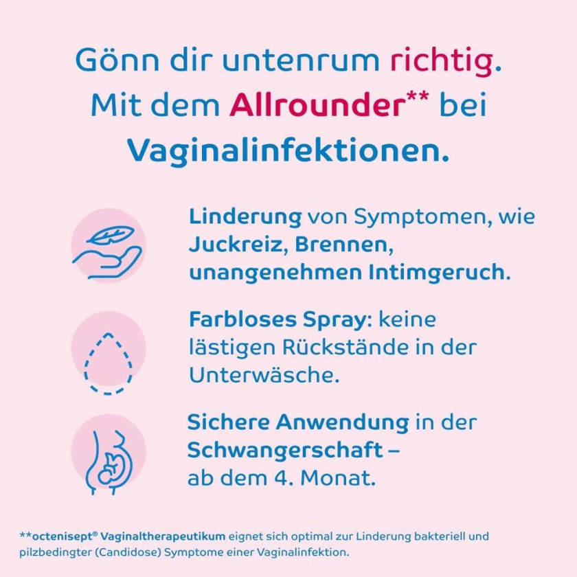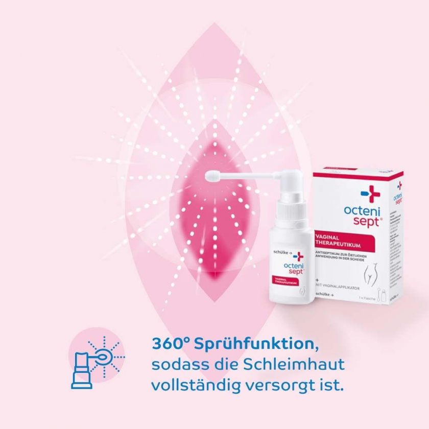 Octenisept® Vaginaltherapeutikum - антисептический препарат для лечения бактериальных и грибковых вагинальных инфекций. Быстро снимает зуд, жжение, покраснения и неприятный запах. Восстанавливает вагинальную флору, подходит для беременных с 4 месяца и лечения партнера. Безрецептурный препарат с удобным аппликатором