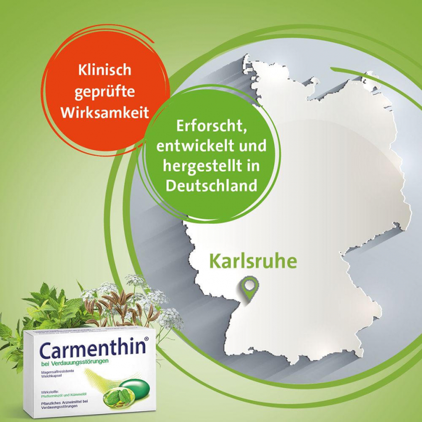 Carmenthin® - лекарственный препарат для лечения диспептических расстройств с натуральной комбинацией масел тмина и перечной мяты. Магниеустойчивые мягкие капсулы действуют непосредственно в кишечнике, снимая спазмы, вздутие и чувство переполнения. Подходит для длительного применения при рецидивирующих проблемах пищеварения.