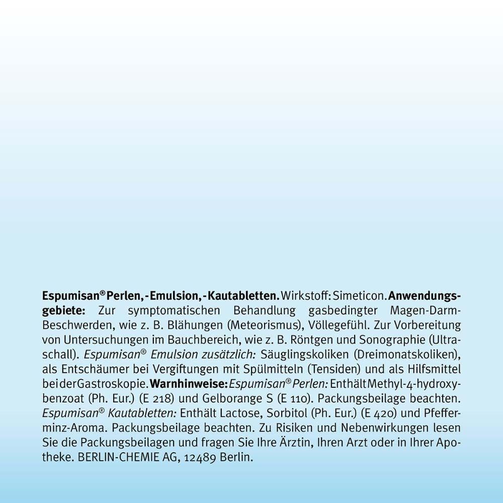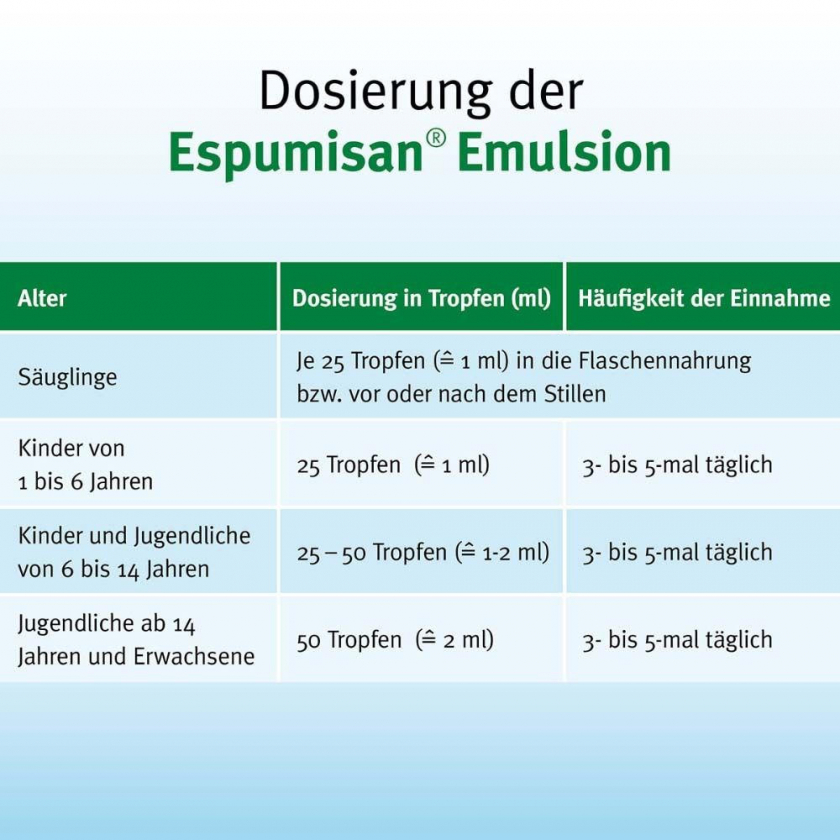 Espumisan® Emulsion - лекарственное средство на основе симетикона для лечения газообразования, вздутия живота и колик у младенцев. Подходит для всех возрастных групп, включая новорожденных, детей и взрослых. Не содержит алкоголь, сахар, ароматизаторы, красители и лактозу. Может применяться при беременности и грудном вскармливании.