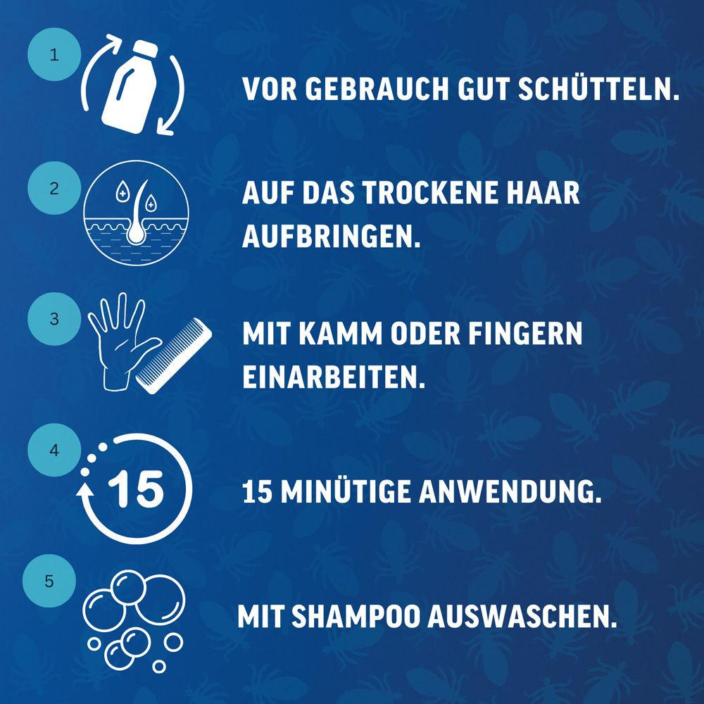 Нанести на волосы и кожу головы, оставить на 15 минут, затем смыть. Повторная проверка через неделю, при необходимости повторить обработку.