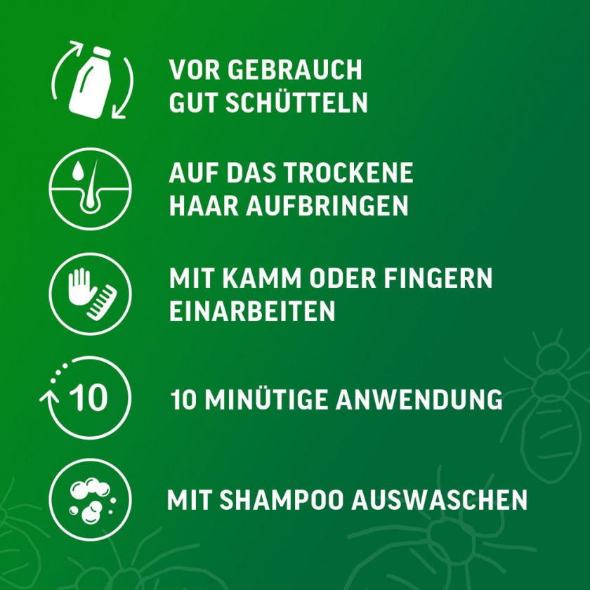 Нанесение на сухие волосы, распределение по всей длине, выдержка 5-10 минут, смывание шампунем, вычесывание вшей и гнид