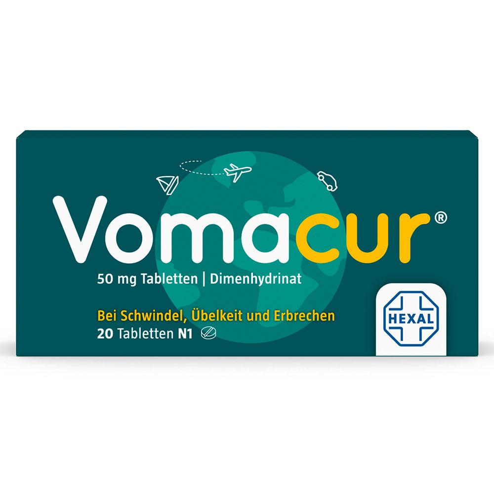 Vomacur® 50 mg - лекарственный препарат для профилактики и лечения укачивания, тошноты, головокружения и рвоты. Содержит дименгидринат - антигистаминный препарат, блокирующий рвотный центр в мозге. Подходит для взрослых и детей от 6 лет с массой тела более 30 кг. Производитель Hexal AG, Германия.