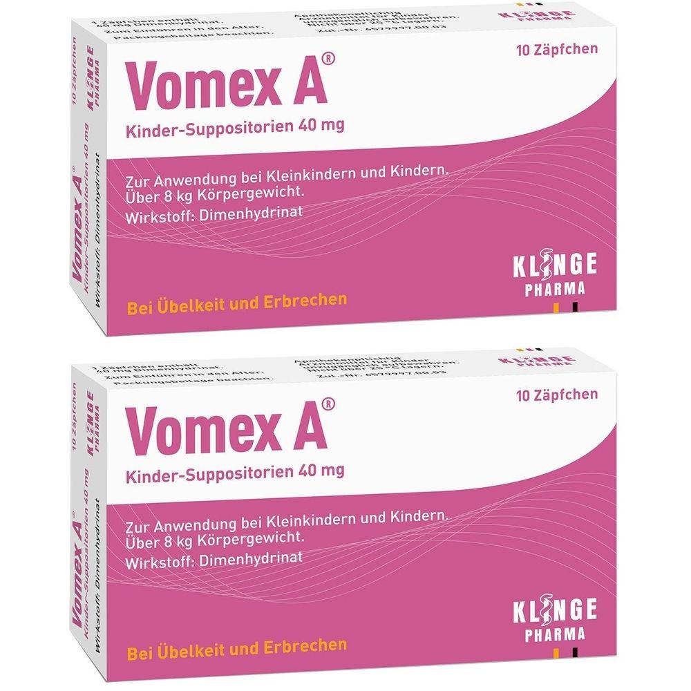 Vomex A® 40 mg детские суппозитории - лекарственное средство для профилактики и лечения тошноты и рвоты у детей от 8 кг. Содержит дименгидринат, блокирующий гистаминовые рецепторы. Применяется ректально в дозировке, зависящей от веса ребенка.