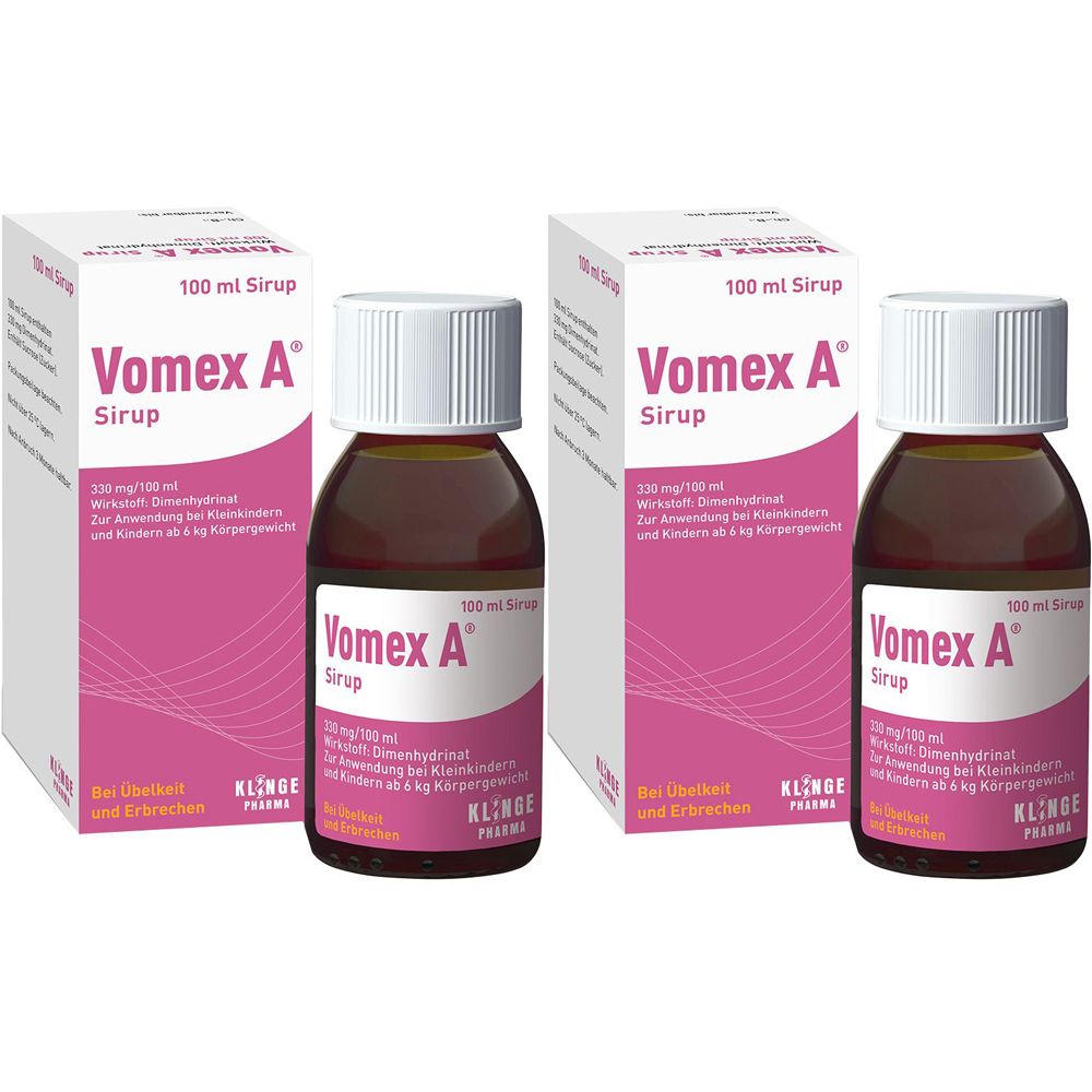 Vomex A® Sirup - детский сироп против тошноты и рвоты на основе дименгидрината. Предназначен для детей от 6 кг веса для профилактики и лечения укачивания и других видов тошноты. Производится в Германии компанией Klinge Pharma GmbH.