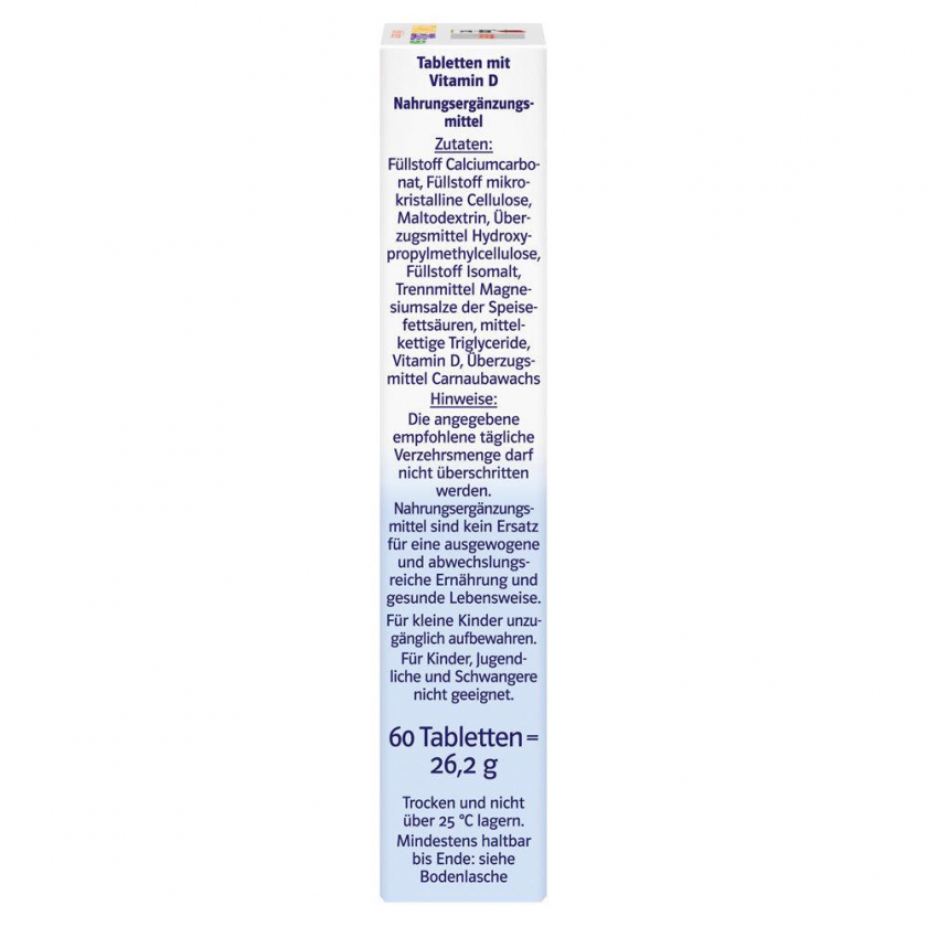 Состав: Кальция карбонат (наполнитель), микрокристаллическая целлюлоза (наполнитель), мальтодекстрин, гидроксипропилметилцеллюлоза (покрытие), изомальт (наполнитель), магниевые соли жирных кислот (разделитель), среднецепочечные триглицериды, витамин D, карнаубский воск (покрытие). Содержит 50 мкг (2000 МЕ) растительного витамина D3 на таблетку