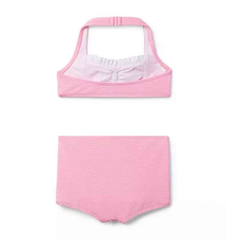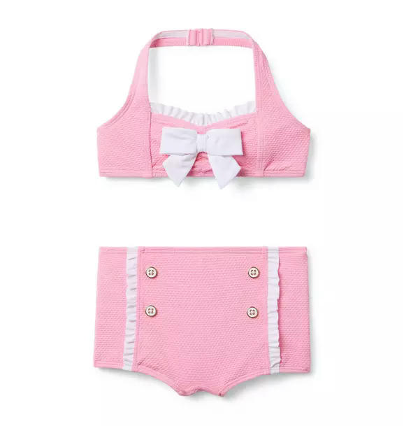 Dive into our retro-inspired, textured swimsuit. Detailed with ruffle trim, button details and a bow, of course. Plus, UPF 50+ sun protection to keep them stylishly safe. Responsibly made with recycled nylon fabric.