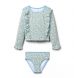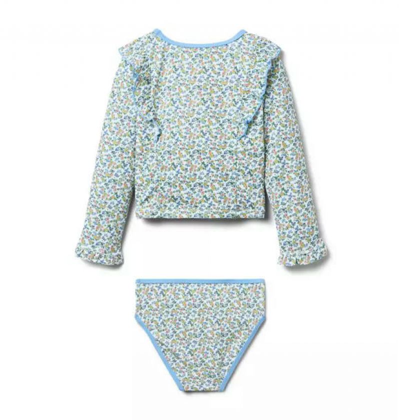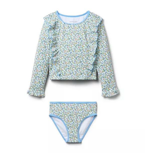 Our ditsy floral rash guard set always has them covered. Designed with ruffle details, contrast trim and UPF 50+ sun protection to keep them stylishly safe. Responsibly made with recycled polyester fabric.