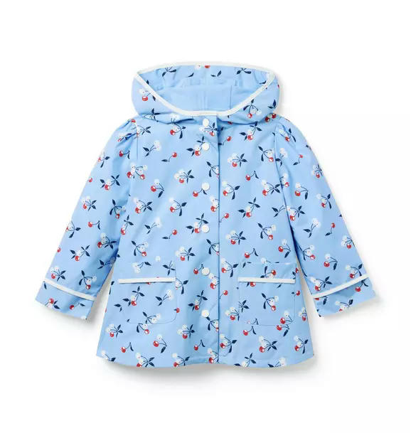 Our favorite pick for a fashionable forecast. With an allover cherry print, hooded silhouette and pockets too, our raincoat is ready for any adventure.