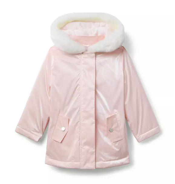 A cozy and chic addition to any look, our shimmering coat features a faux fur trimmed hood and pockets for the little things.