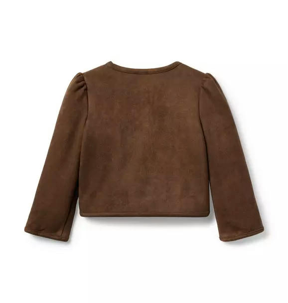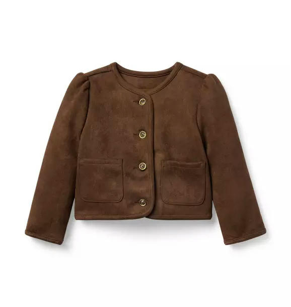 A jacket that will always be in fashion’s favor. Designed in soft sueded fabric with puff sleeves and enamel buttons, plus pockets, of course.