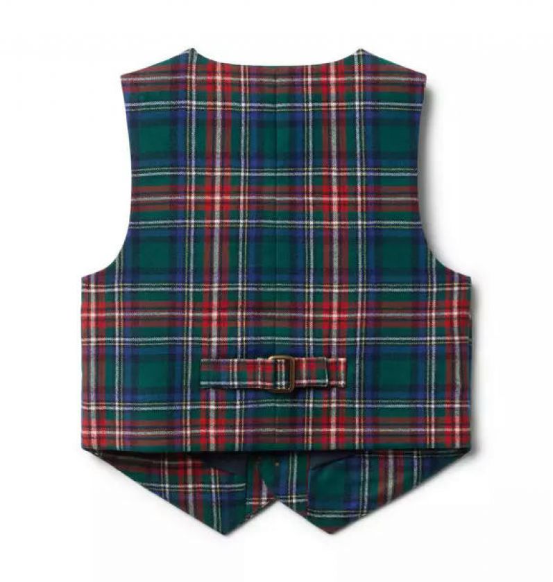 Well-suited for the holidays, our tartan wool vest is a festive favorite. Detailed with a buckle back and welt pockets too.
