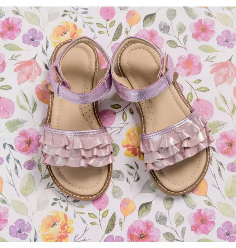 Elevate your little one's style with the luxurious Flamenco sandals! Crafted from premium metallic suede-like leather, these sandals feature three beautiful leather ruffles on the vamp for added texture. The hook-and-loop closure ensures easy on and off, while the cushioned heel provides extra comfort and support. Breathable leather lining and a cushioned leather-covered footbed guarantee all-day comfort. The flexible rubber outsole offers excellent flexibility and durability for all their adventures. These sandals combine fashion and function, adding effortless style to any outfit.