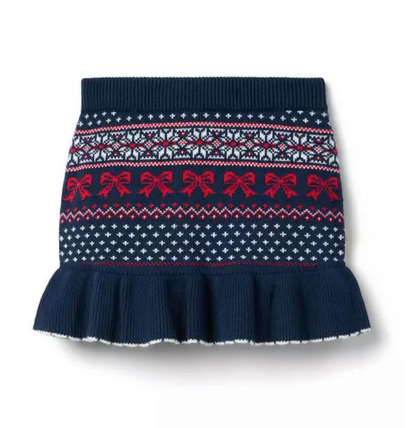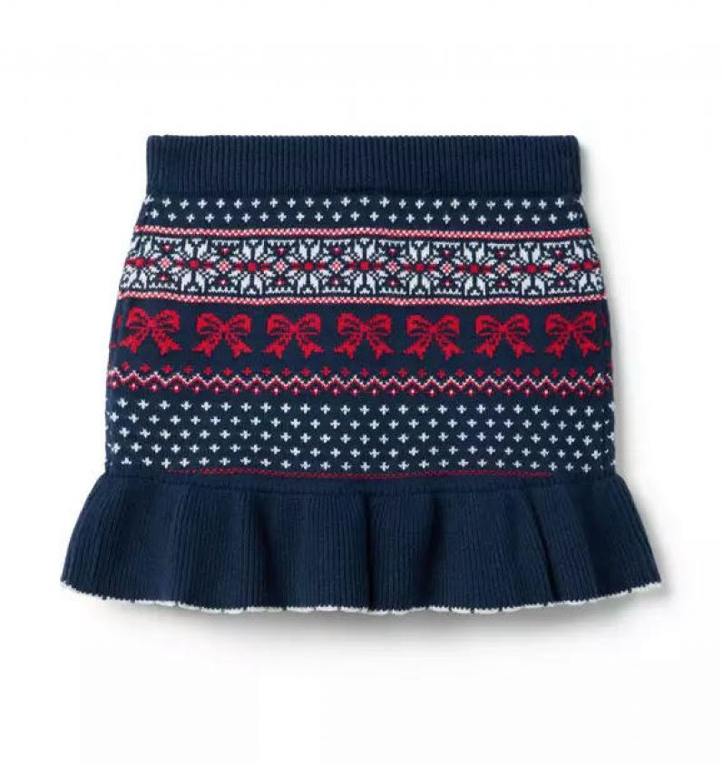 Our cozy sweater skirt is just right for twirling through the season. With an allover Fair Isle bow design, ribbed ruffle hem and contrast scalloped trim.